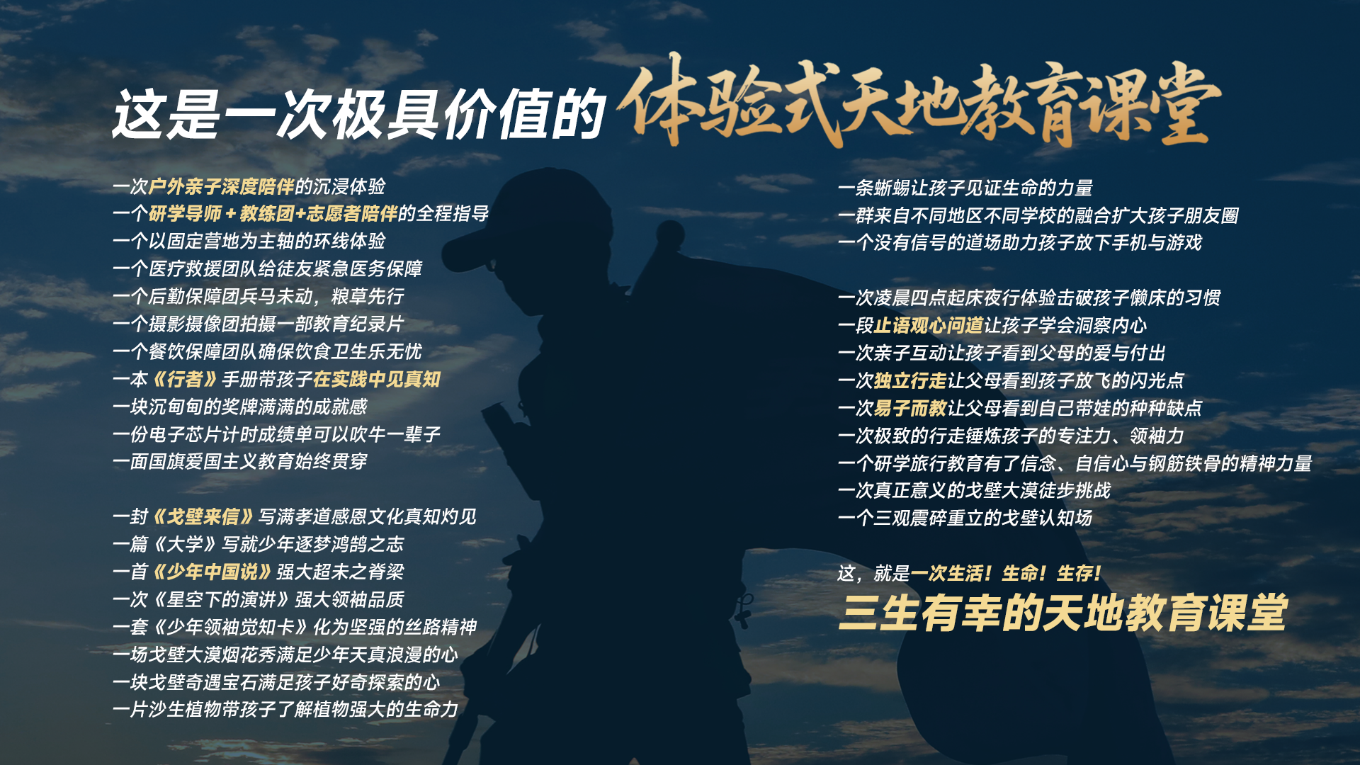 真正的教育,是对生命的唤醒。父母与孩子一起历经陪伴、磨砺、突破、重生,用一次坚毅的戈壁之行,实现个体与生命的对话,亲子关系的和解与升华,也磨炼出未来中国的新少年、新领袖、新力量。