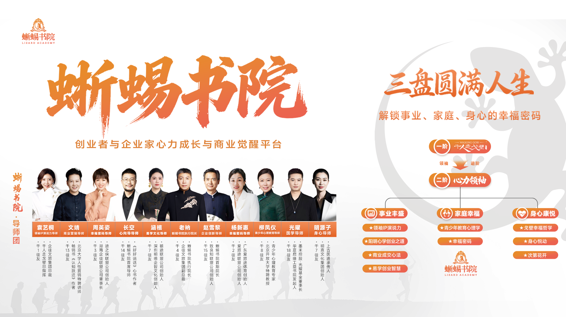 蜥蜴书院以实现“事业(丰盛)、家庭(幸福)、身心(康悦)”三盘圆满为发展愿景,聚合徒友企业家中具备大影响力的商业智慧、国学经典、阳明心学、易学文化、家庭教育与青少年心理学、领袖演说、IP打造等领域的专业资源,为全国徒友量身定制三盘圆满的领袖智慧进阶系统。