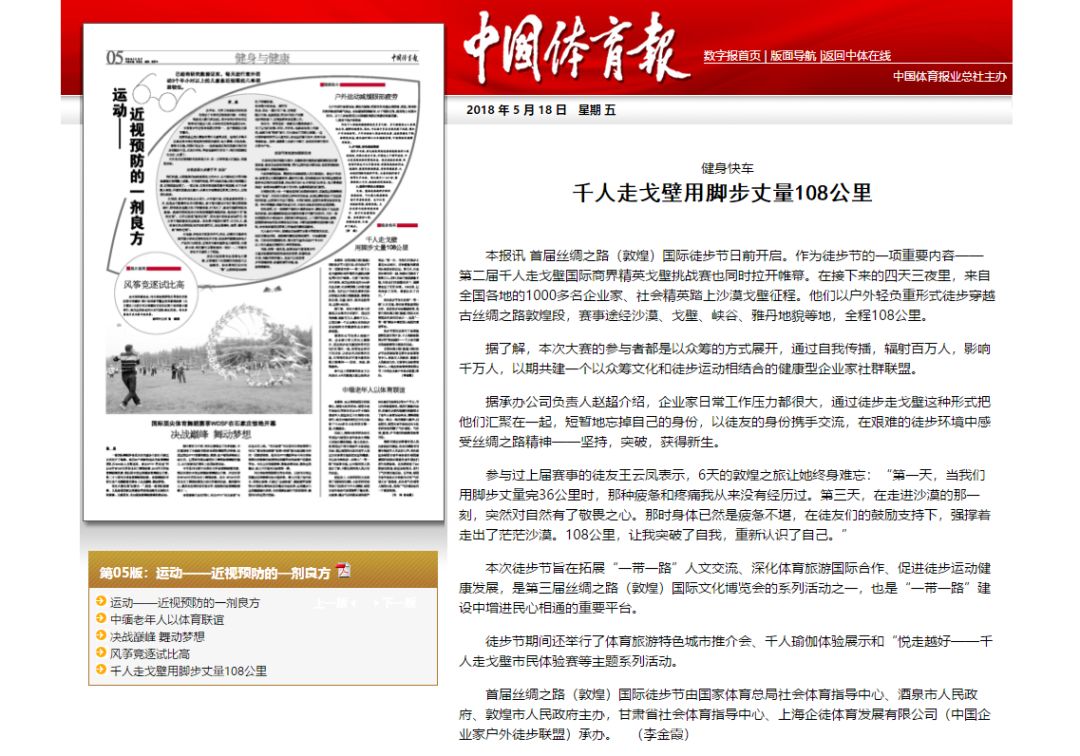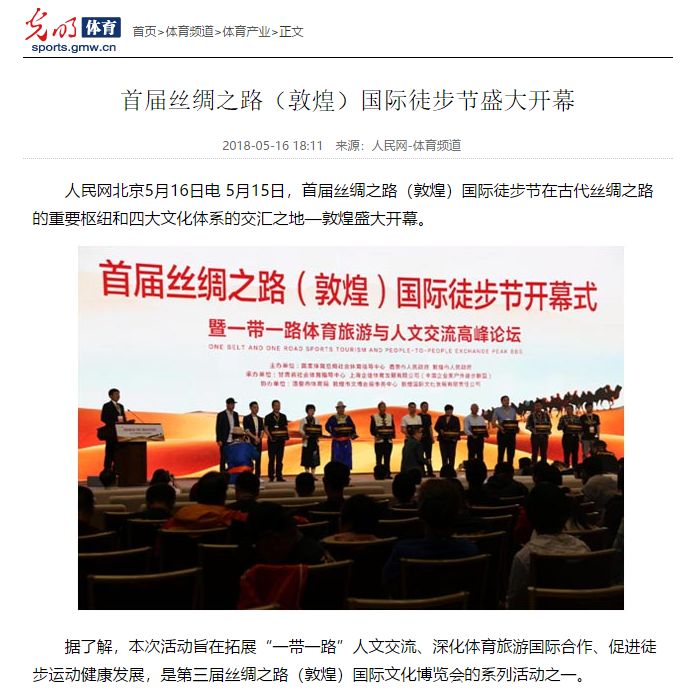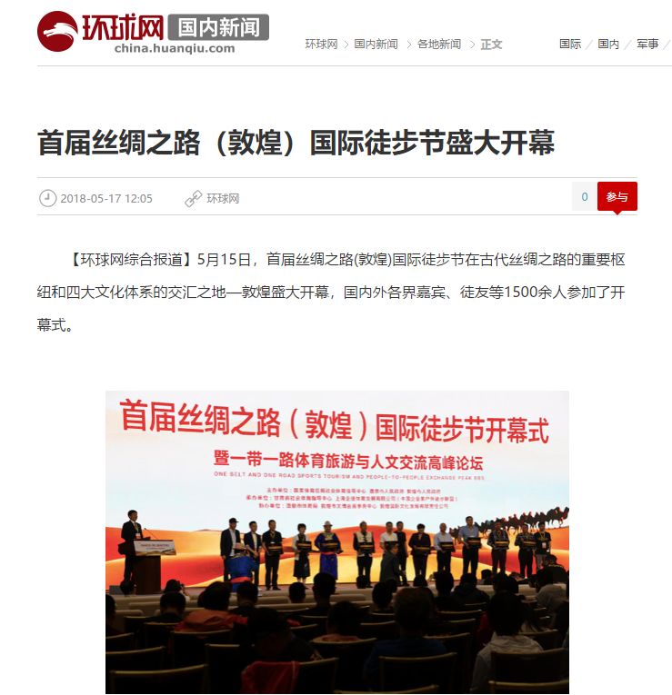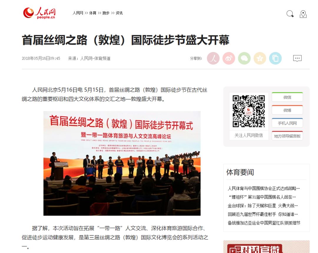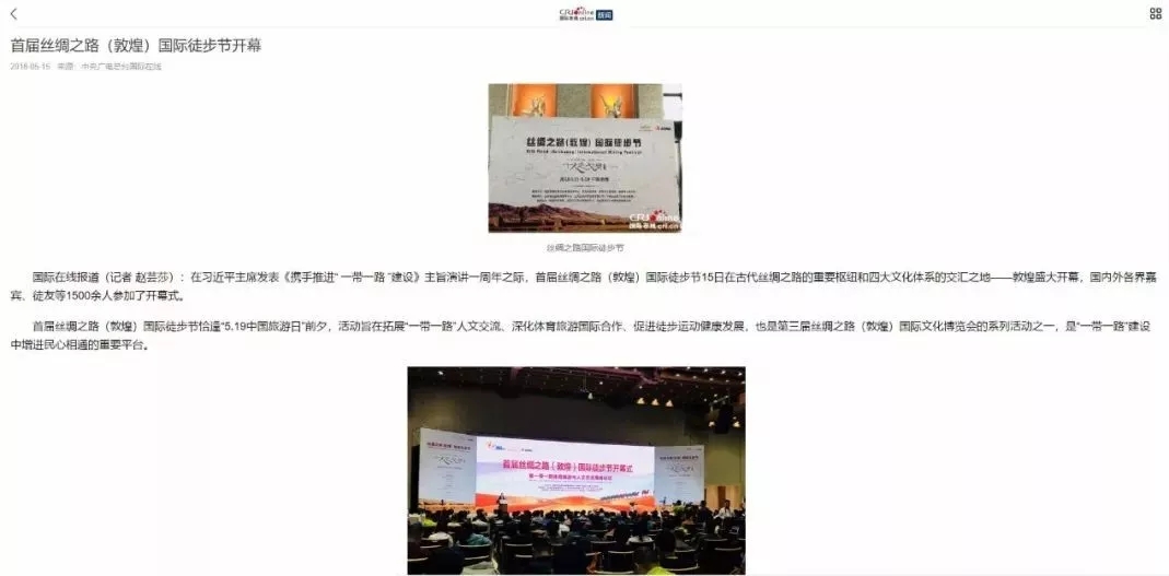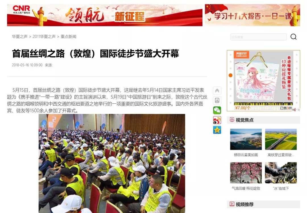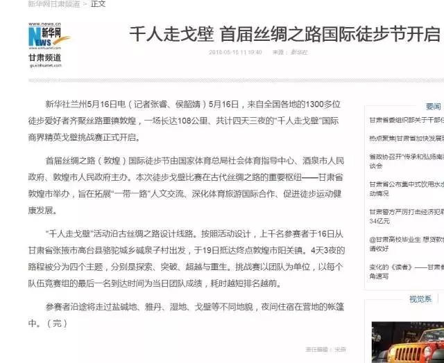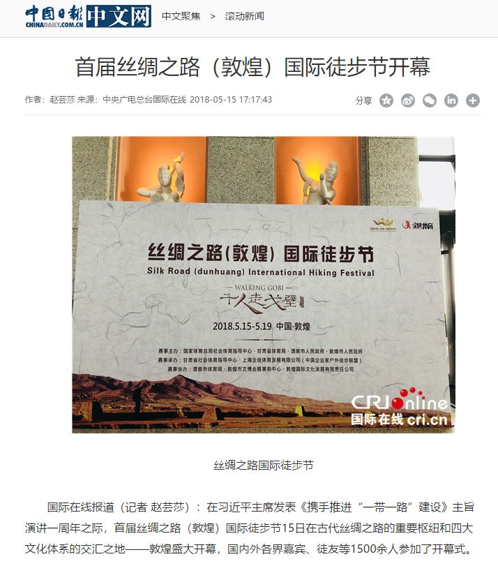 5月19日,首届丝绸之路国际徒步节、第二届千人走戈壁在敦煌圆满落幕,第二届千人走戈壁吸引全球8个国家1300余名企业家、商界精英踏上古老商道,全国各大媒体卫视纷纷聚焦这一戈壁徒步盛宴!